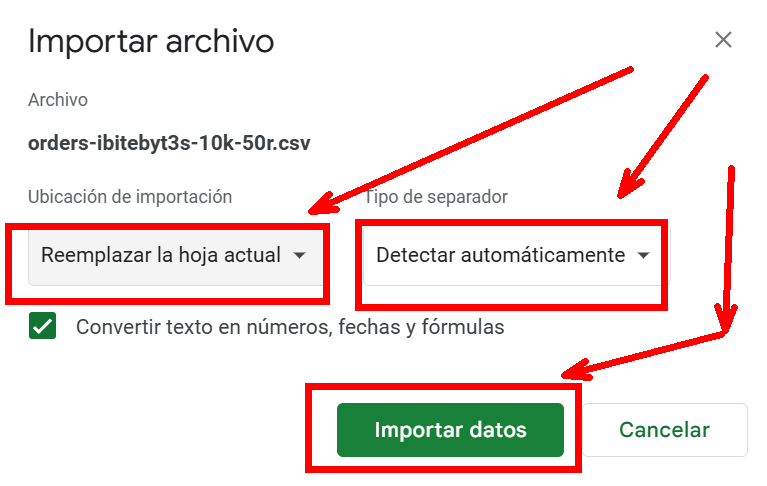 - Configura Ubicación de importación en Reemplazar hoja de cálculo actual.