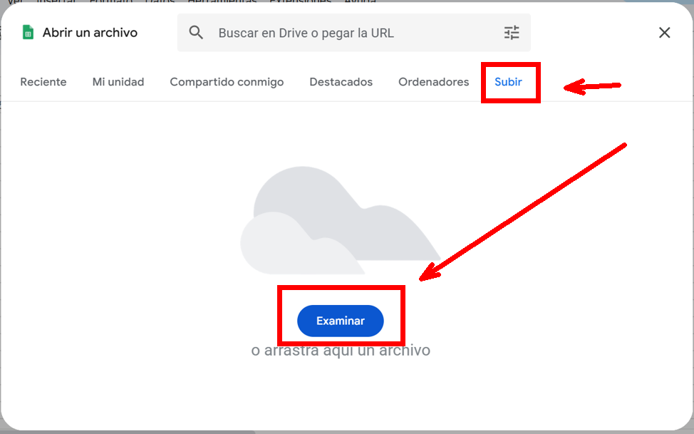 - Ve a Archivo > Importar > Subir > Examinar, luego selecciona el archivo